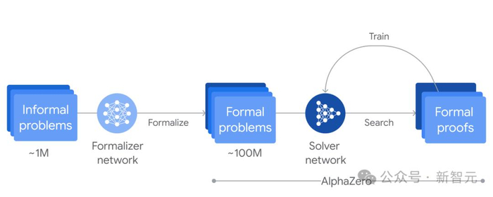 AlphaProof强化学习训练循环的流程信息图:大约一百万个非正式数学问题由形式化网络翻译成形式化数学语言;接着,求解网络通过搜索这些问题的证明或反驳,并利用AlphaZero算法逐步训练自己,以解决更具挑战性的问题