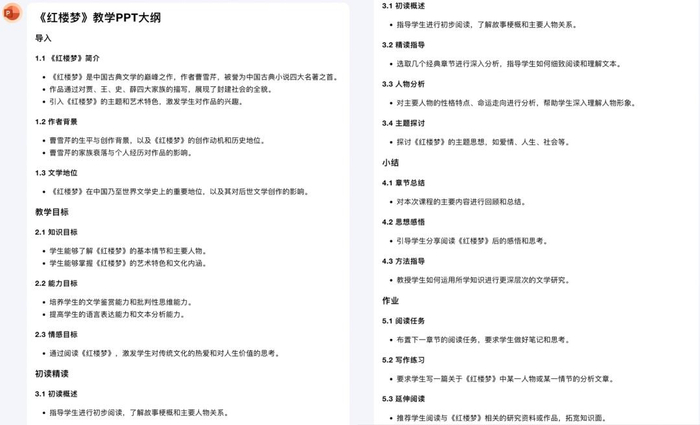 我们让生成一份《红楼梦》的教学 PPT 大纲,直接输入咒语: