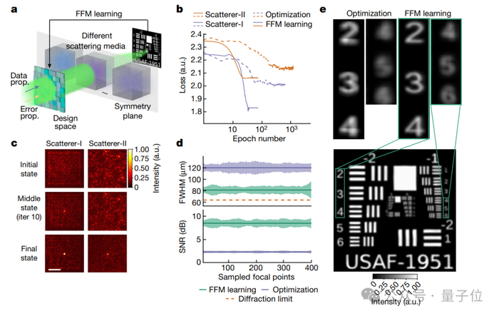 图e进一步评估了设计的焦点阵列在扫描位于散射介质后面的分辨率图时的性能。