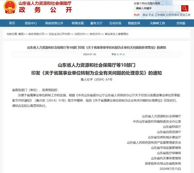 2019年,山东省政府办公厅曾就省属事业单位转制为企业有关问题的处理意见发文,指导部分省属事业单位转为国有企业或非国有企业、股份制企业。此次《意见》明确了转制单位工作人员人事劳动关系转换、省属事业单位转制后社会保险关系接续、原编制内女性工作人员退休年龄、企业登记、土地资产处置等问题,以及事业单位转制为私营企业有关问题的处理意见。