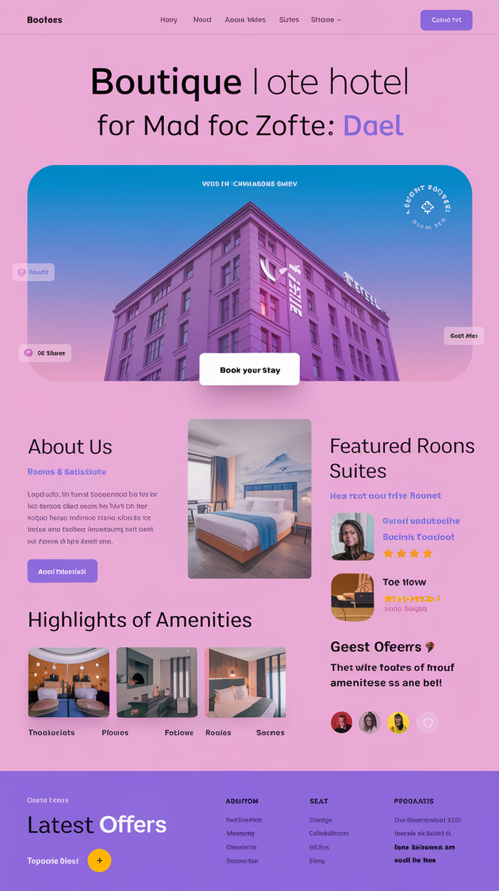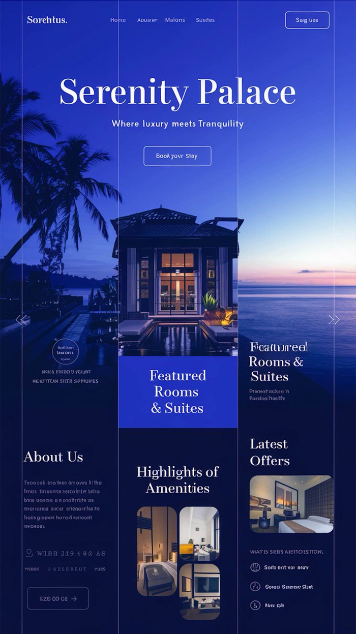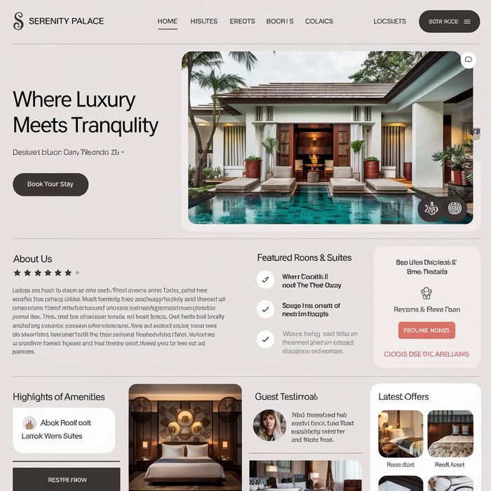 A web design draft for a boutique hotel that:Home Page Hero Section Title: “Serenity Palace” Subtitle: “Where Luxury MeetsTranquility” Background: Full-width image slider showcasing hotel’s best features CTA: “Book Your Stay” button About Us section Featured Rooms & Suites Highlights of Amenities Guest Testimonials Latest Offers