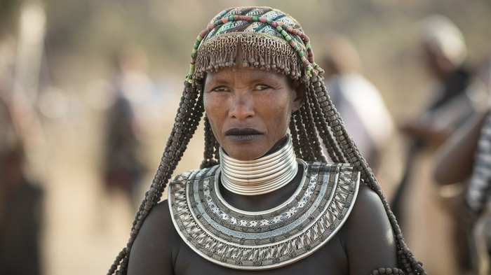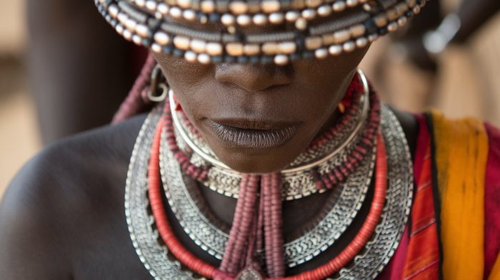 Cultural Adornments: A close-up of a woman wearing traditional tribal jewelry, showcasing the intricate patterns of beads and metalwork.The focus is on her lips and the unique texture of her dark skin, with her eyes slightly out of focus but still captivating.