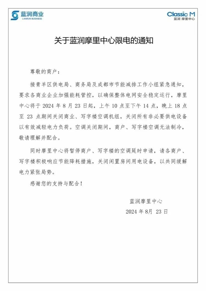 成都限电的最大原因就是高温。据新华社报道,8 月 21 日,四川电网用电负荷两次创下历史新高,最高达 6797 万千瓦,较去年最大用电负荷增长近 13%。因此四川省多地电网公司发布节约用电倡议,倡导大家错峰用电,保证正常的居民用电。