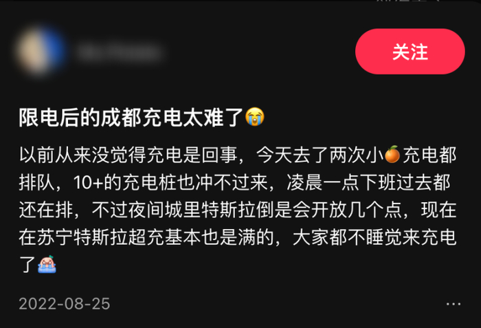 2022 年 8 月,四川省出现极端高温、降雨量小、电力负荷创新高等情况,工业用电被限制,民用电也进行了计划性的短暂停电,限电潮下新能源车车主苦不堪言。你仍然能看到部分车主两年前的吐槽“凌晨一点下班过去还在排队充电”,“来福士排队一小时充电”。