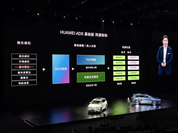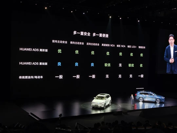 再来说说华为ADS基础版,和完整版最大的差异主要是亮点,首先这是基于“无激光雷达”的方案,然后车载本身的算力也会相对少一些。而在能力上,主动安全能力基本没有变化(生效范围和刹停时速都有变化),不过智驾场景就只提供高快智驾和泊车能力,在复杂天气、夜间驾驶和复杂城区这三点上就不如高阶版ADS智驾。