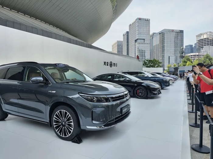此外,电车通受邀来到发布会现场也见到,鸿蒙智行旗下品牌目前6款在售的新车一字排开,这种规模和气势已经非常接近传统车企的新品发布会,而少了一些过去华为操办时“科技企业”的气质。