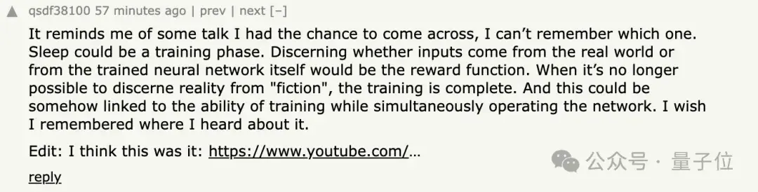 睡眠可能是一种训练过程。在这个过程中,我们的大脑需要判断信息是来自真实世界还是它自己通过训练形成的神经网络。当我们无法区分现实和虚构时,训练就完成了。
