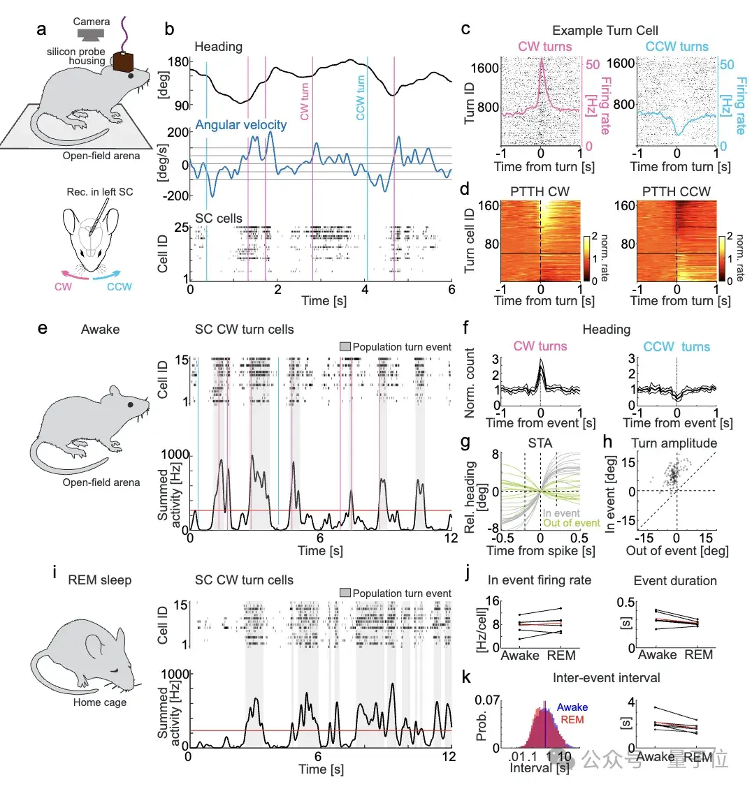 首先,研究人员记录了清醒状态下小鼠左侧上丘的神经活动。他们发现,约一半的上丘神经元在头部转动时会显著改变活动,这些神经元被称为“转向细胞(turn cells)”。