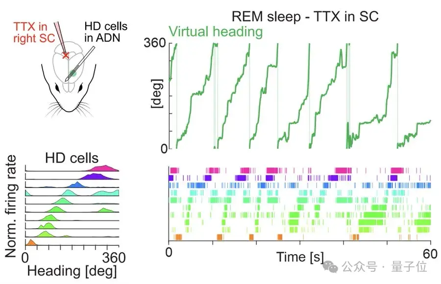 结果又显示,这种阻断导致REM睡眠中顺时针方向的虚拟头部转动显著增加,甚至出现连续的360°顺时针虚拟转动。