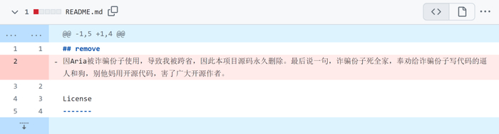 根据事件报道,开发者在得知项目被利用后,删除了项目的全部代码,并在项目的README文件中留下了最后的更新记录,宣告项目永久关闭。