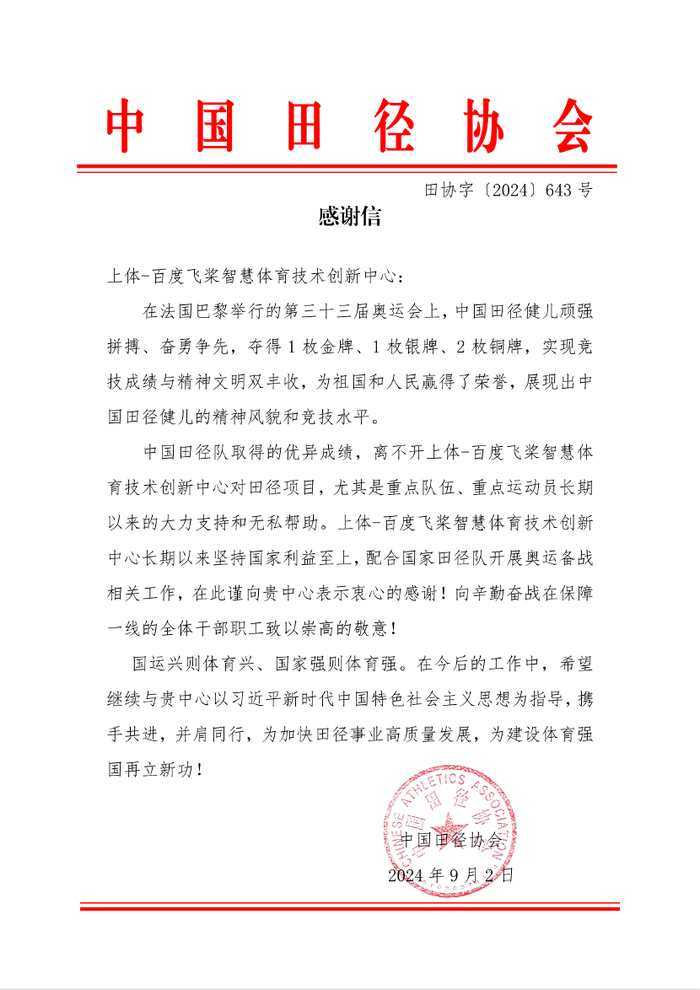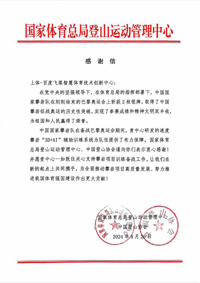 巴黎奥运会8月11日落下帷幕,中国体育代表团拼下91枚奖牌,40金、27银、24铜!近日,百度 AI 陆续收到国家体育总局游泳运动管理中心、中国田径协会、中国国家体育总局登山运动管理中心及中国登山协会的感谢信。信中,国家队高度认可和赞扬了百度为队伍训练提供的重要技术支撑与服务保障。百度“文心体育解决方案”(原3D+AI 品牌升级,首次对外表述)长期服务多支国家队,利用 AI 技术帮助运动员提升训练表现、创造优异成绩,率先实现 AI 落地体育运动应用的成功案例。