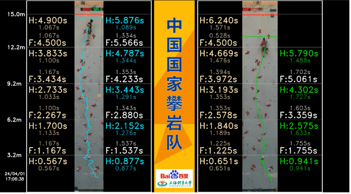 在国家攀岩队,研发了速度攀岩的分阶段用时对比与3D 姿态分析系统,对高速且复杂的速度攀岩动作进行实时且精准的量化评估,包括:分段用时、攀爬轨迹、攀爬速度、人体3D 姿态、世界记录对比、重影叠加分析等。