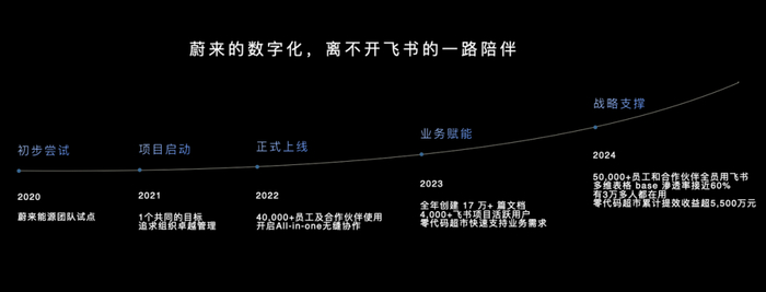 从 2020 年充换电团队开始试点,到 21 年我们开始设定共同的目标,到 22年我们开始 all in one 地去用,然后到现在我们上万多员工加上 2 万多合作伙伴的员工都在全员用多维表格,渗透率接近 60%。零代码超市替蔚来省了 5, 500 万。
