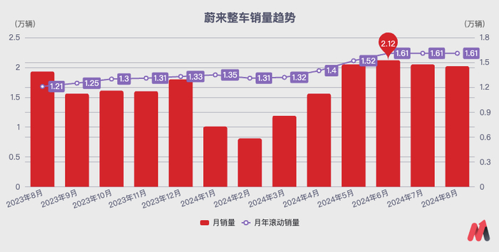 蔚来品牌的销量从今年4月开始快速回升,强势遏制了“月滚动销量”(过去12月总销量求平均,消除淡旺季销量波动)的下滑趋势,逐步将月销量和月滚动销量提升到了2万辆/月和1.6万辆/月的水平。