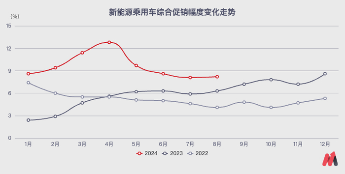 新能源市场新品数量逐年增加,在细分市场产品更密集、竞争更激烈之余,还推动了全市场的“价格战”。尤其从去年年中开始,新能源乘用车的促销幅度就开始持续攀升,最终在今年4月创下了12.8%的新高。