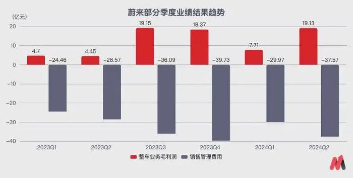 先说制造能力,蔚来2024年二季度在销量不足6万辆的情况下,车辆毛利率已经提升至12.2%的新势力头部水平。销售管理费用方面,今年二季度销量提升了超过100%,销售管理费用只提升了31.5%。