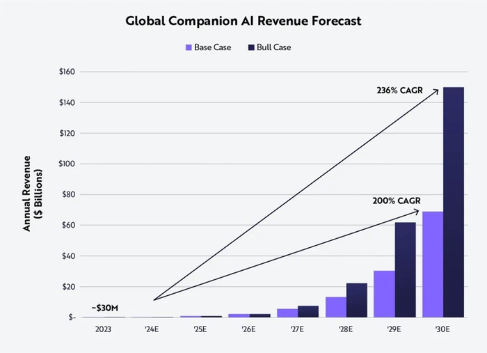 根据著名投资机构Ark Invest最新发布的研究报告显示,到2030年,全球AI陪伴市场规模有望从目前的3000万美元,增长至1500亿美元,实现5000倍的爆发式增长。
