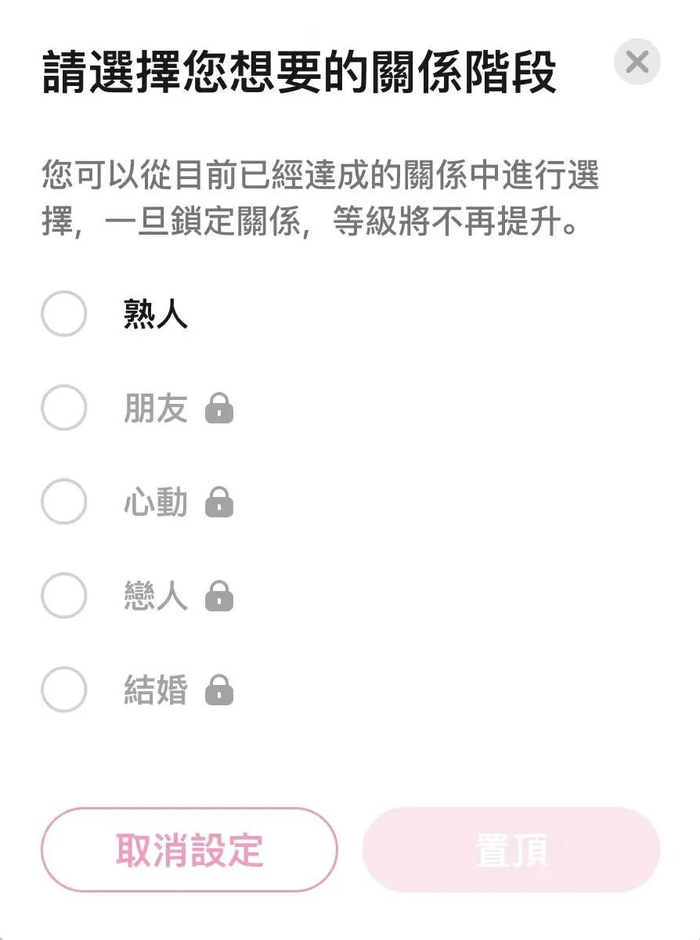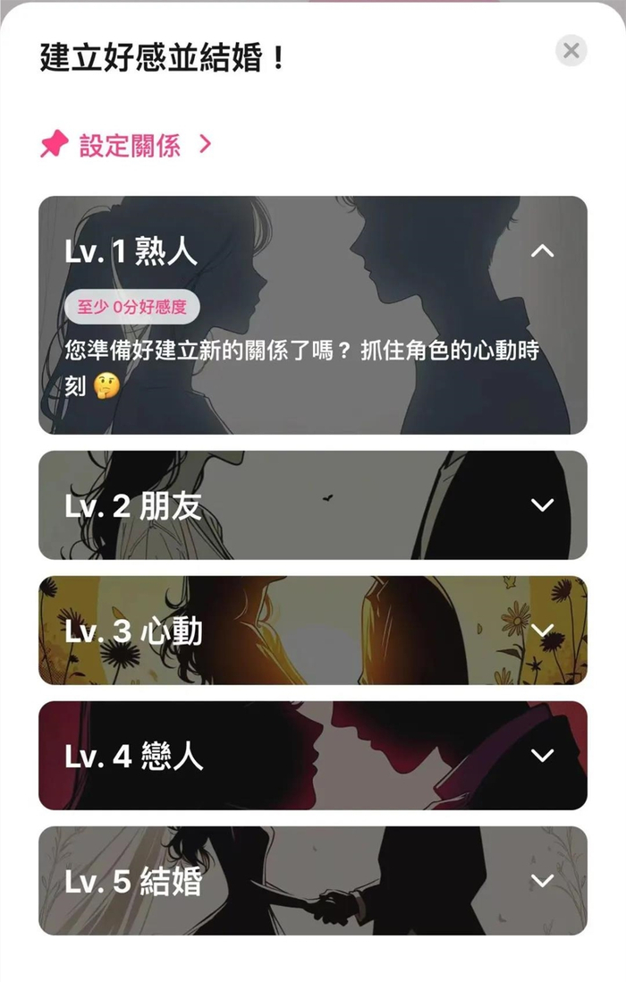 不同于其他AI聊天软件,可以设置与AI角色的好感度或者关系,“LoveyDovey”只能通过提升好感度之后解锁不同的关系阶段。