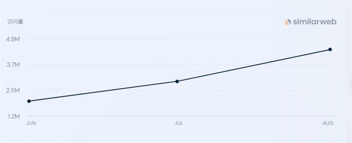 根据数据分析平台Similarweb的数据,Talkie(Minimax旗下产品,星野海外版)八月访问量达440万,环比增长51.7%。今年六月,Talkie全球月活跃用户数已达1100万。