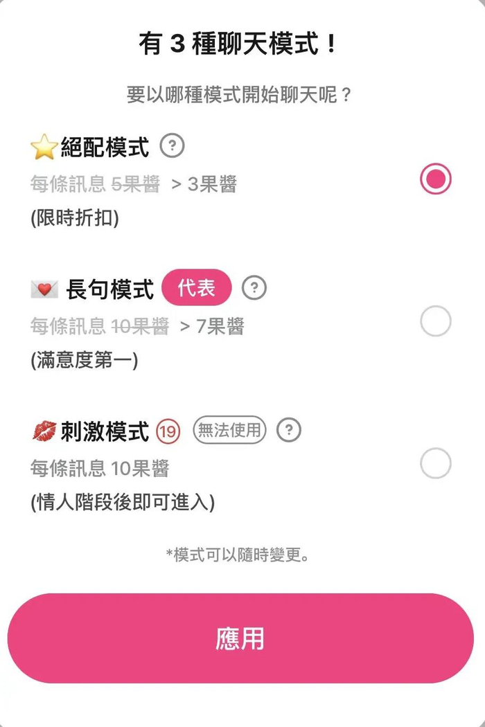 “Lovey Dovey”有三种聊天模式可选:短句模式、长句模式和刺激模式(通过成人认证后才能使用),分别消耗3、7、10数量的果酱。
