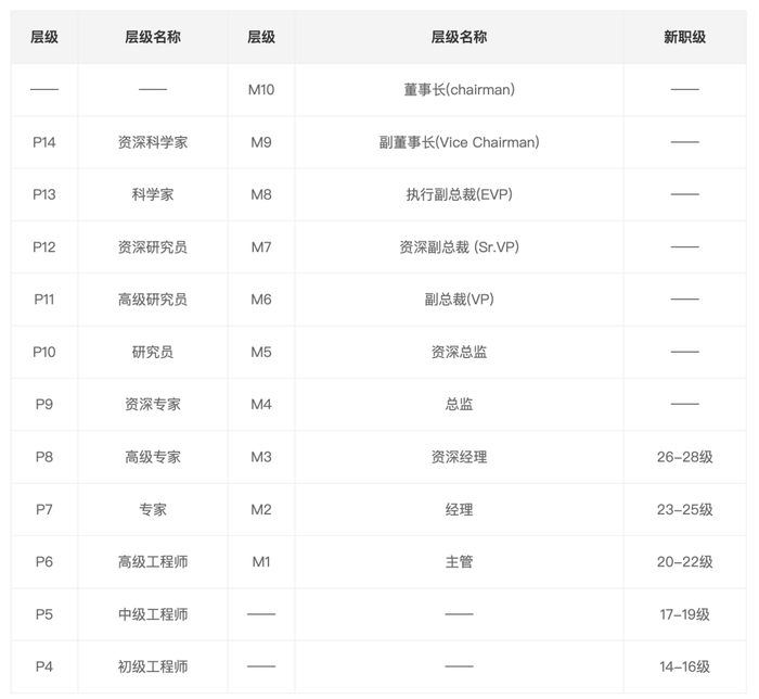 这些年来,它的职级体系也不是一成不变,经历了多次调整,我这里有一张图,展示了阿里的就技术岗职级P体系,以及现在的新职级体系(14级往上)。