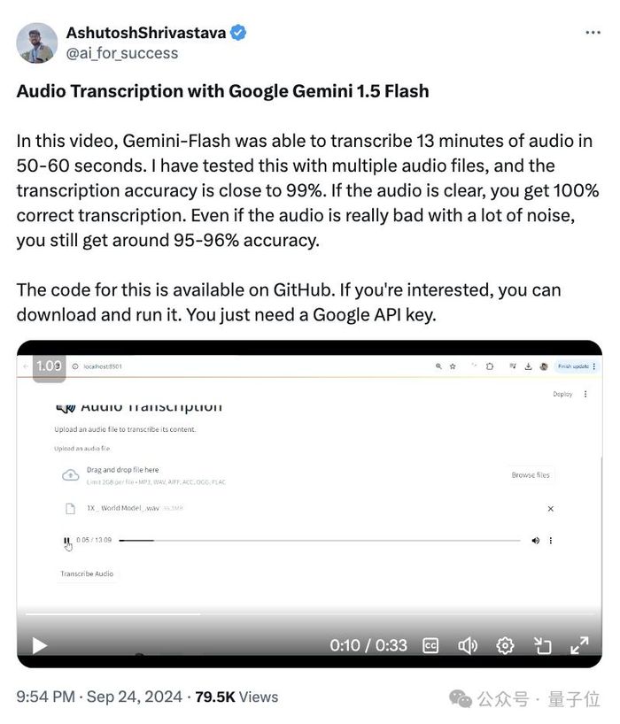 他测试了Gemini 1.5 Flash的音频转录功能。后者能在50-60秒内转录13分钟音频。