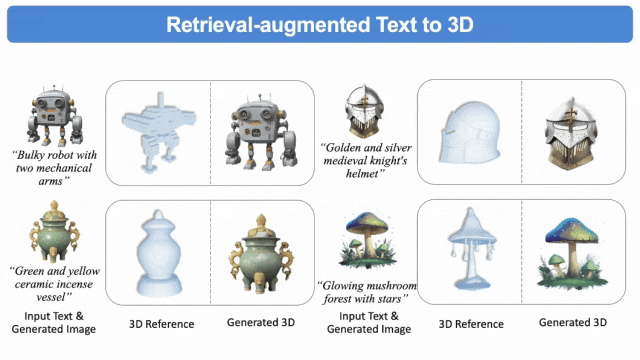 该框架将语言和图像生成领域中常见的检索增强生成(RAG)引入3D生成。