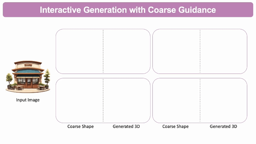交互式3D生成:通过自定义的粗略3D形状作为参考,用户可以不断调整所生成的3D模型的几何结构。