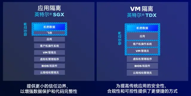 目前这方面的技术,成熟且应用较多的,当属英特尔® 软件防护扩展(Intel® SGX)和英特尔® 信任域扩展(Intel® TDX),它们或在内存中构建被称为“飞地”(Enclave)的安全区域,能做到应用隔离,来保护最关键的敏感应用和关键数据,或将TEE环境扩展到虚拟机层面,实现虚拟机隔离,来保护某个虚拟机环境中的数据和应用程序免遭未经授权的访问。