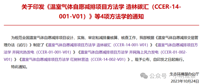 2023年10月24日,生态环境部发布了造林碳汇、并网光热发电、并网海上风力发电、红树林营造等4项温室气体自愿减排项目方法学。