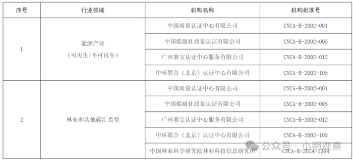 2024年6月11日,国家认监委发布第一批温室气体自愿减排项目审定与减排量核查机构,共包括5家机构,涉及能源产业(可再生/不可再生资源)、林业和其他碳汇类型等2个领域。