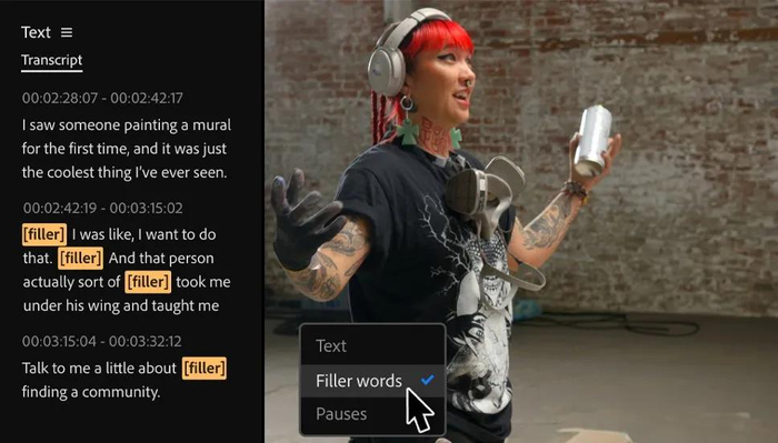 - 功能概述:自动生成视频的文字稿,通过高亮文本将片段添加到时间线,用户可以像编辑文档一样编辑、重新排序、修剪视频片段。同时,支持一键删除冗余停顿和填充词。