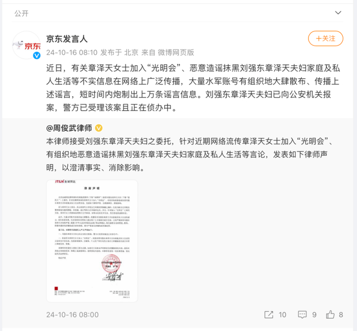 京东夫妇遭遇大规模网络谣言,已向警方报案并发表律师声明
