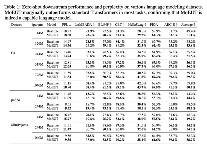 研究者在 C4、SlimPajama 和 peS2o 语言建模数据集、以及 The Stack 代码数据集上测试 MoEUT 的能力,结果表明,循环对于模型实现具有竞争力的性能至关重要。同样地,研究者在 BLiMP 和儿童图书测试、Lambada、HellaSwag、PIQA 和 ARC-E 等下游任务上展现了良好的零样本性能。