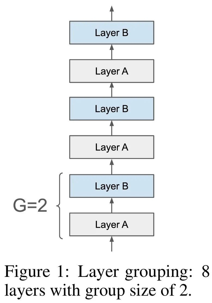 下图 1 提供了一个示例,标记为「层 A」(或层 B)的所有层在整个网络中共享相同的参数。组 G 的大小是非共享层的数量。在研究者的实验中,组大小在 2 到 4 之间,典型的循环步骤数为 8 或 9。