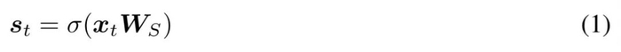 在每个 token 位置 t,给定层输入 x_t ∈ R^d_model,MoE 前馈层会为每个专家计算一个分数,从而得到一个向量 s ∈ R^N_E,其计算如下: