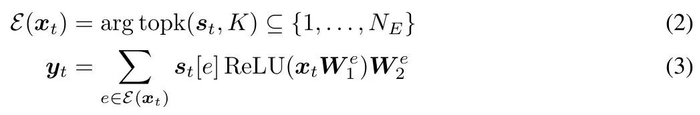 MoE 层仅选择与 s_t ∈ R^N_E 中 top-K 元素相对应的 K 个专家(从 N_E 中),来产生层输出 y_t ∈ R^d_model,如下所示: