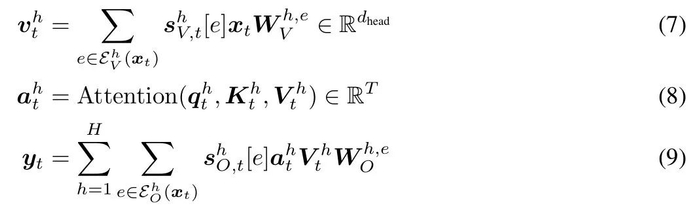 键和查询「照常」计算:给定位置 t 处的一个输入,x_t ∈ R^d_model,并且 k^h_t = x_tW^h_K、q^h_t = x_tW^h_Q,h ∈{1,...,H} 是头索引。专家对这些值的选择计算如下: