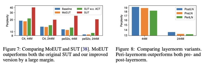 结果如图 7 所示。与 MoEUT 和参数匹配的密集基线相比, SUT 在性能上有明显的劣势。研究者认为这种性能低下的主要原因是作者将 ACT 机制作为其模型的主要组成部分之一。移除 ACT 后,性能显著提高。然而,即使在这种设置下,它的性能仍然低于 MoEUT 和标准 Transformer 基线。
