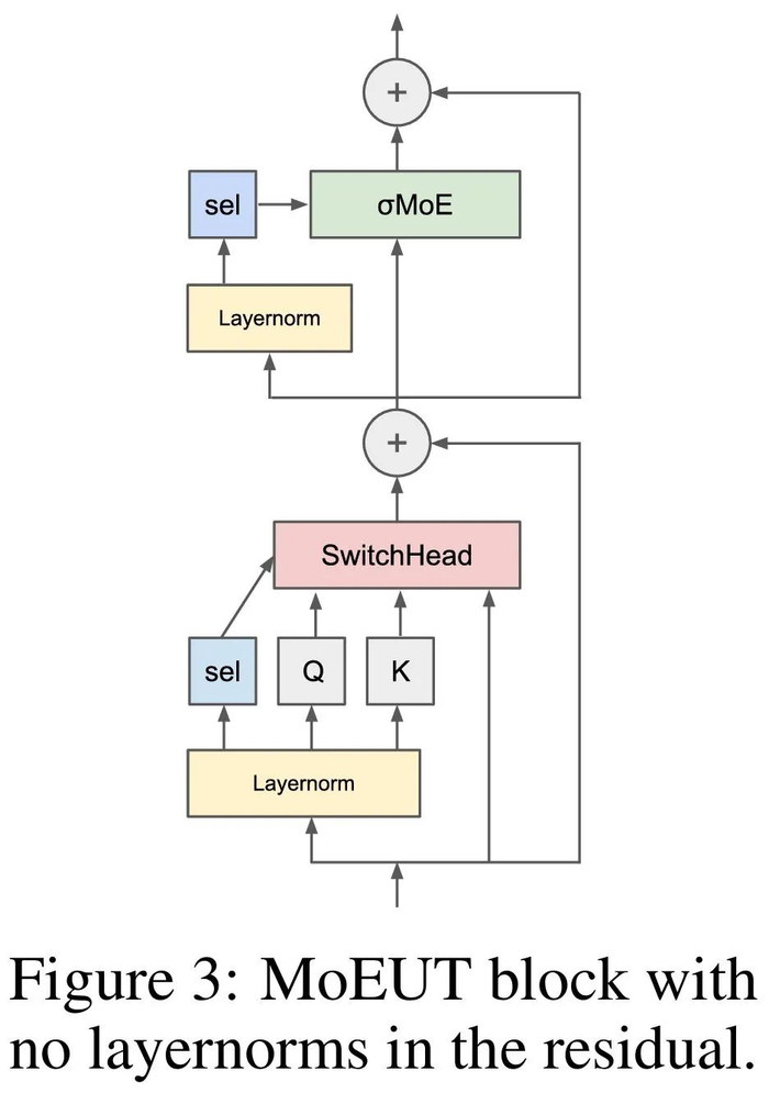 研究者提出另一种方法来避免上述问题:在「主数据路径」中不使用分层归一化。这意味着,对于本文的 UT,在注意力值投影之前不使用分层矩阵,在 σ-MoE 层之前也不使用分层矩阵。相反,只有在紧跟着 sigmoid 或 softmax 激活函数的线性层(在这些非线性层之前产生关键的重归一化激活)之前,即注意力中的查询和关键投影、注意力层和前馈层上的专家选择以及最终分类层之前,才会使用 layernorm。如图 3 所示。