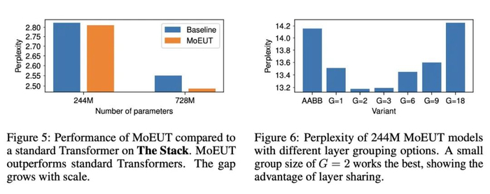 图 6 展示了 layer grouping 对 244M 参数 MoEUT 模型的影响。研究者发现 G = 2 是最佳值,而且层维度的循环确实是有益的。