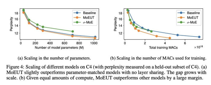 MoEUT 的 Scaling 结果如图 4 所示。y 轴显示的是 C4 held-out 子集上的复杂度。在参数数量相同的情况下,MoEUT 模型略微优于密集模型(图 4a),而且随着规模的扩大,差距呈扩大趋势。研究者还与非共享 σ-MoE 模型进行了比较,该模型的表现明显不如 MoEUT,这表明共享层具有明显的优势。此外如图 4b 显示,就训练期间所有前向传递所花费的总 MAC 运算次数而言,MoEUT 远远优于基线密集模型。