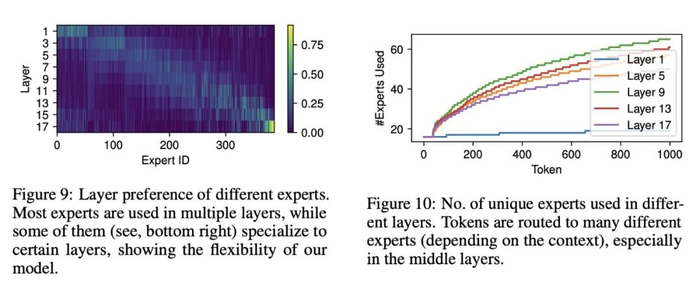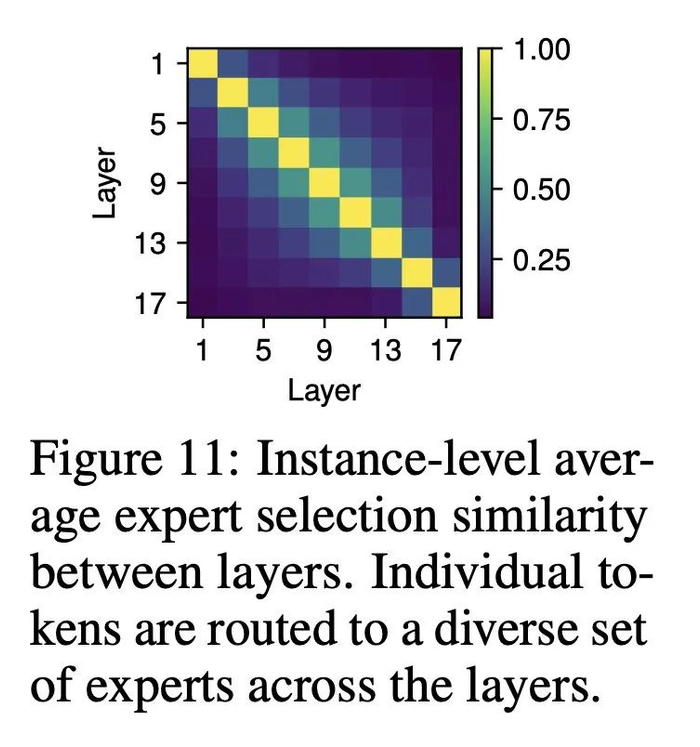 各栏/位置的专家选择动态。结果如图 11 ,在后续层中,所选专家之间存在不可忽略的重叠;但是,这种重叠还远远没有达到完全重叠的程度。这表明,专家通常在单列中动态变化,在不同层中执行不同的功能。