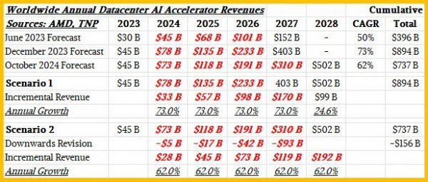 第二种情况则是对整个预测模型做出修订,这应该也是AMD想要达到的效果(否则也无法解释为什么此次公布了更低的年均复合增长率数字)。如大家所见,2024年至2027年(含)之间有1560亿美元AI加速器销售额被从结果中移除。与2023年12月的此前预测相比,2024年10月最新预测的累计销售额将减少这1560亿美元。