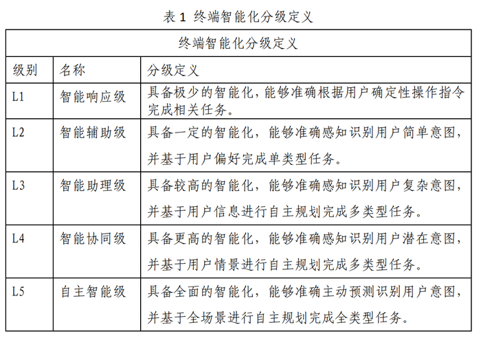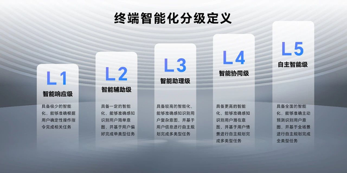 《报告》将终端智能化分为从“智能响应级”到“自主智能级”五大等级:L1-L5,分别为智能响应级、智能辅助级、智能助理级、智能协同级和自主智能级。