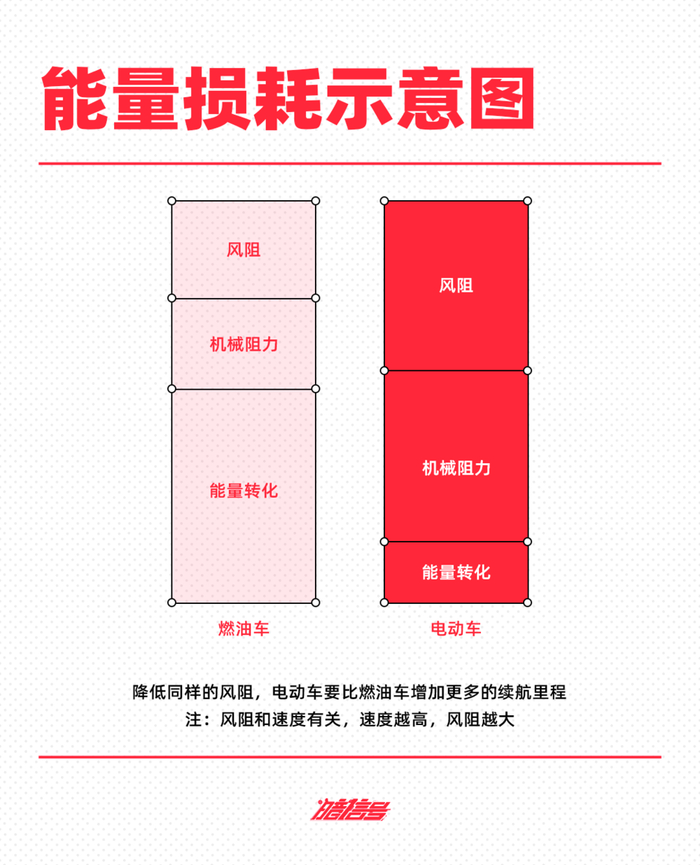 至于为何如此,则要从驱动形式的变化说起。在燃油车中影响能耗的首要因素是发动机热效率,如果想要降低能耗,最有效的方法是把热效率提高。然而到了电动汽车上,这个方法就不可行了。电池电机的能量转化率极高,优化空间很小。所以,原先影响不那么大的风阻,影响占比就变得大了起来。