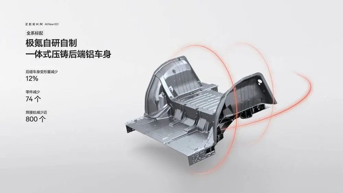 其中,工艺轻量化在目前车企的宣传中常见,最有代表性的是一体化压铸,新势力和传统车企都在推。几十上百个零件合为一个,不仅可省去零件设计制造安装过程,还能因为大幅减少焊点和多余结构,实现10-30%的减重。