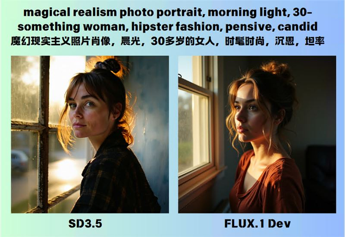 优点是SD3.5出图有时候更写实,FLUX对皮肤的绘制一般都比较油腻,SD3.5比较细腻更真实一点