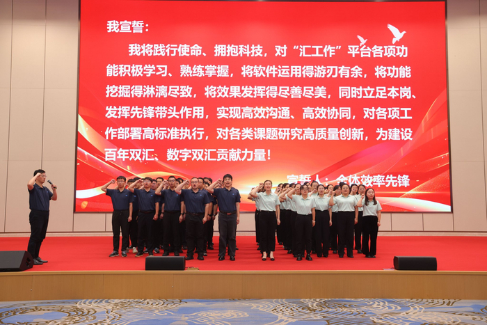 为了更好推动飞书的全面落地和用深,双汇还启动了首届效率先锋大赛,第一期将招募 180 名效率先锋,并至少落地 30 个降本增效场景,逐步开始 AI 项目的共建和探索。大会现场邀请到 50 名效率先锋代表进行宣誓誓言,代表们表示将「为百年双汇、数字双汇贡献力量」。接着,万宏伟鼓舞大家说,「效率先锋是企业数字化转型、提质增效的先行者,希望我们的先锋队伍可以牢记宣誓誓言,潜心钻研、勇于实践,将先进的协同办公工具转换为管理效率提升的钥匙,将科技转换为生产力。」