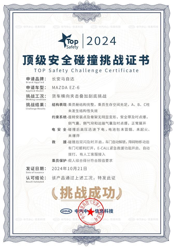 安全,是 EZ-6 传承马自达的核心 DNA。本次发布会,长安马自达公布了 EZ-6 行业首次「货车横向夹击叠加刮底挑战」成绩。本次碰撞测试基于丁字路口大货车高速冲撞车身侧面,叠加车辆底盘电池包托底,最后撞向墙面的真实场景,挑战难度堪称「地狱级」。发布会上,中国汽车技术研究中心有限公司首席专家、中汽信息科技 (天津) 有限公司总工程师王军雷对本次碰撞测试做了深度解读,并向长安马自达汽车销售分公司执行副总经理吴旭曦颁发了「001 号顶级安全证书」。